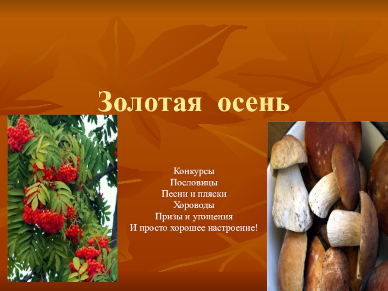Золотая осень КонкурсыПословицыПесни и пляскиХороводыПризы и угощенияИ просто хорошее настроение!