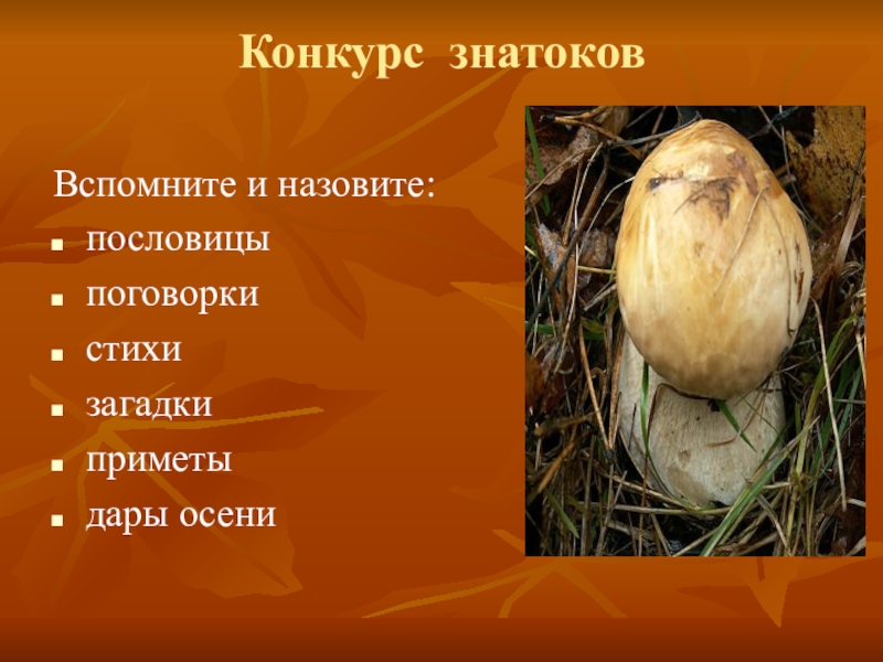 Конкурс знатоков Вспомните и назовите:пословицыпоговоркистихизагадкиприметыдары осени