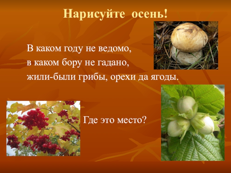 Нарисуйте осень!    В каком году не ведомо,   в каком бору не гадано,