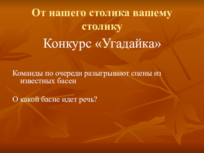 От нашего столика вашему столикуКонкурс «Угадайка»Команды по очереди разыгрывают сцены из известных басенО какой басне идет речь?