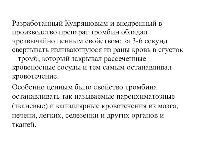 Слайд 9Разработанный Кудряшовым и внедренный в производство препарат тромбин обладал чрезвычайно ценным