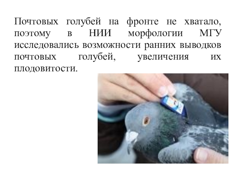 Слайд 14Почтовых голубей на фронте не хватало, поэтому в НИИ морфологии МГУ
