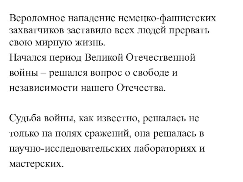 Слайд 4Вероломное нападение немецко-фашистских захватчиков заставило всех людей прервать свою мирную жизнь.