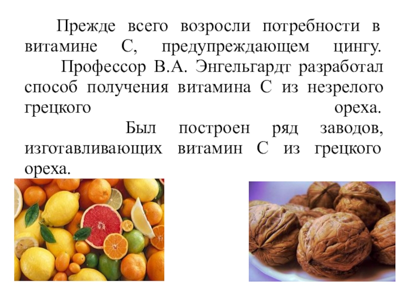 Профессор В.А. Энгельгардт разработал способ получения витамина С из незрелого грецкого ореха.