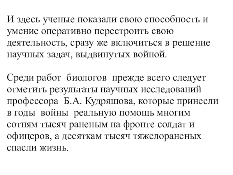 Среди работ биологов прежде всего следует отметить результаты научных исследований профессора Б.А. Кудряшова, которые принесли в годы войны реальную помощь многим сотням тысяч раненым на фронте солдат и офицеров, а десяткам тысяч тяжелораненых спасли жизнь.