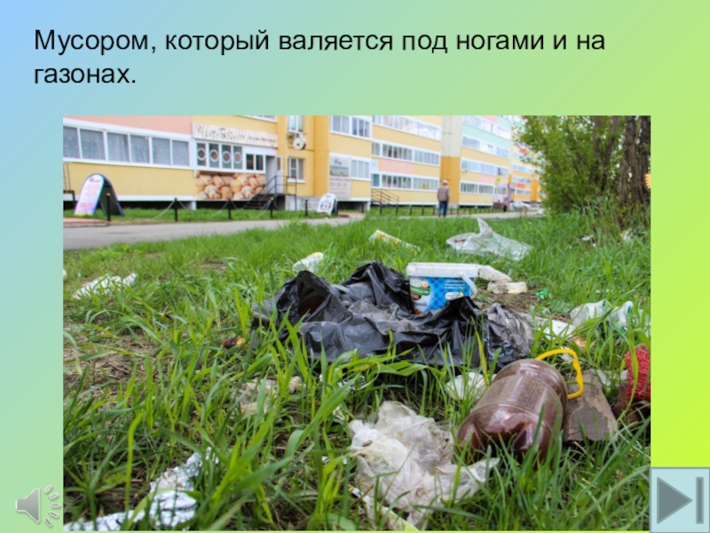 Слайд 7Мусором, который валяется под ногами и на газонах.