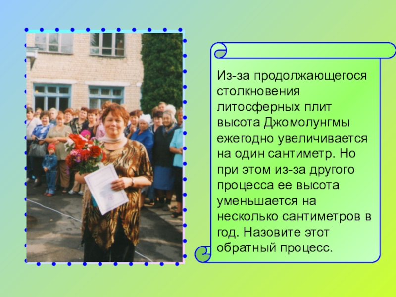 на один сантиметр. Но при этом из-за другого процесса ее высота уменьшается на несколько сантиметров в год. Назовите этот обратный процесс.