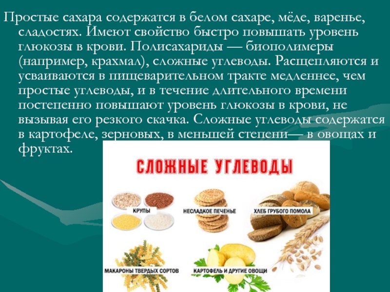быстро повышать уровень глюкозы в крови. Полисахариды — биополимеры (например, крахмал), сложные углеводы. Расщепляются и усваиваются в пищеварительном тракте медленнее, чем простые углеводы, и в течение длительного времени постепенно повышают уровень глюкозы в крови, не вызывая его резкого скачка. Сложные углеводы содержатся в картофеле, зерновых, в меньшей степени— в овощах и фруктах.