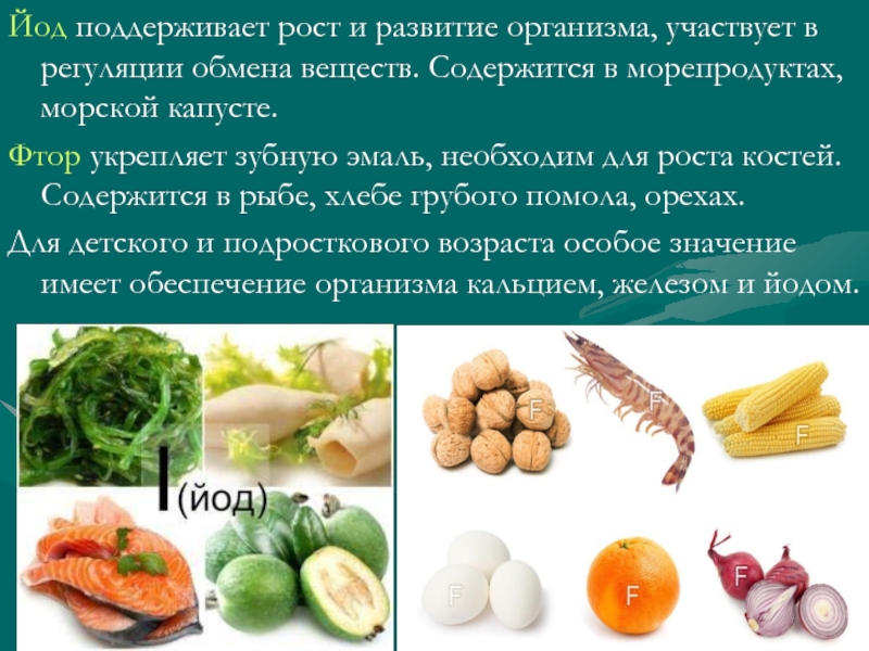 Слайд 44Йод поддерживает рост и развитие организма, участвует в регуляции обмена веществ.