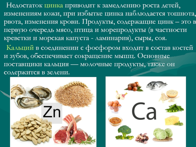 цинка наблюдается тошнота, рвота, изменения крови. Продукты, содержащие цинк – это в первую очередь мясо, птица и морепродукты (в частности креветки и морская капуста - ламинария), сыры, соя.