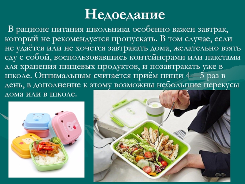 В том случае, если не удаётся или не хочется завтракать дома, желательно взять еду с собой, воспользовавшись контейнерами или пакетами для хранения пищевых продуктов, и позавтракать уже в школе. Оптимальным считается приём пищи 4—5 раз в день, в дополнение к этому возможны небольшие перекусы дома или в школе.
