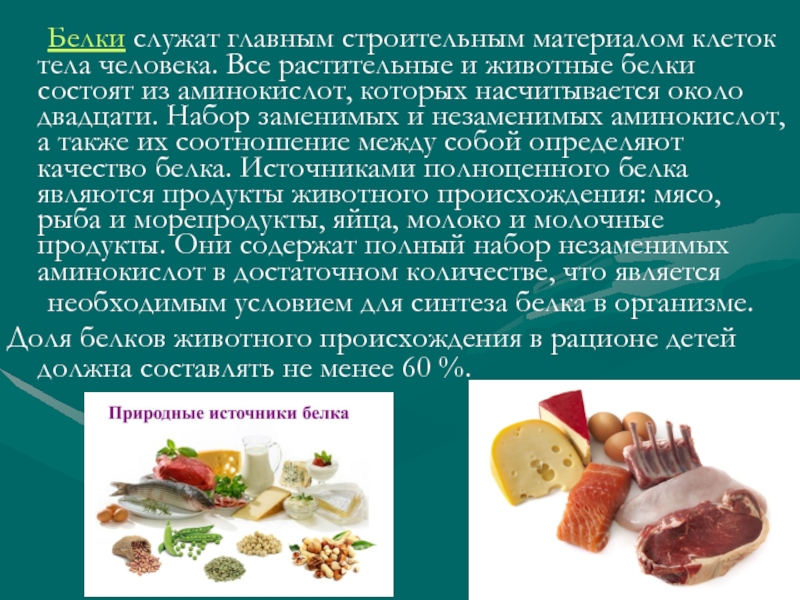 животные белки состоят из аминокислот, которых насчитывается около двадцати. Набор заменимых и незаменимых аминокислот, а также их соотношение между собой определяют качество белка. Источниками полноценного белка являются продукты животного происхождения: мясо, рыба и морепродукты, яйца, молоко и молочные продукты. Они содержат полный набор незаменимых аминокислот в достаточном количестве, что является