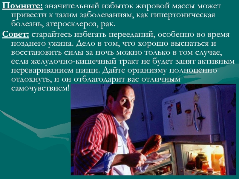 Слайд 20Помните: значительный избыток жировой массы может привести к таким заболеваниям, как
