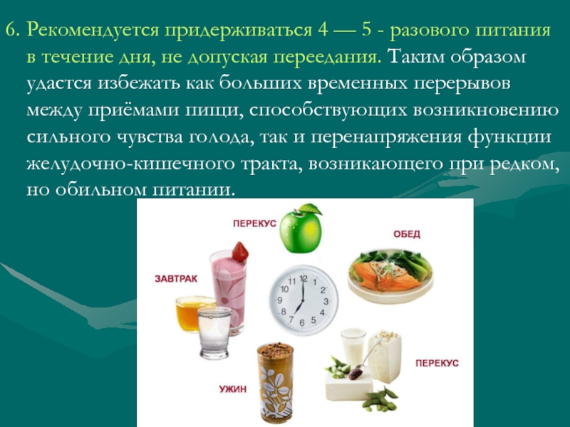Слайд 516. Рекомендуется придерживаться 4 — 5 - разового питания в течение