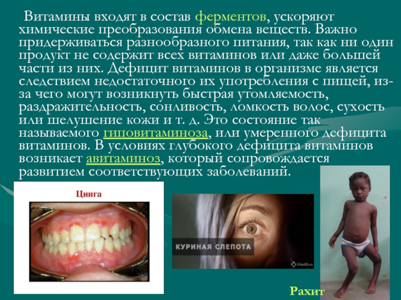 Слайд 32 Витамины входят в состав ферментов, ускоряют химические преобразования обмена веществ. Важно