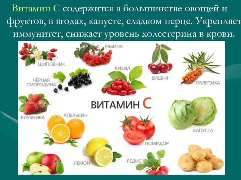 Слайд 35Витамин С содержится в большинстве овощей и фруктов, в ягодах, капусте,