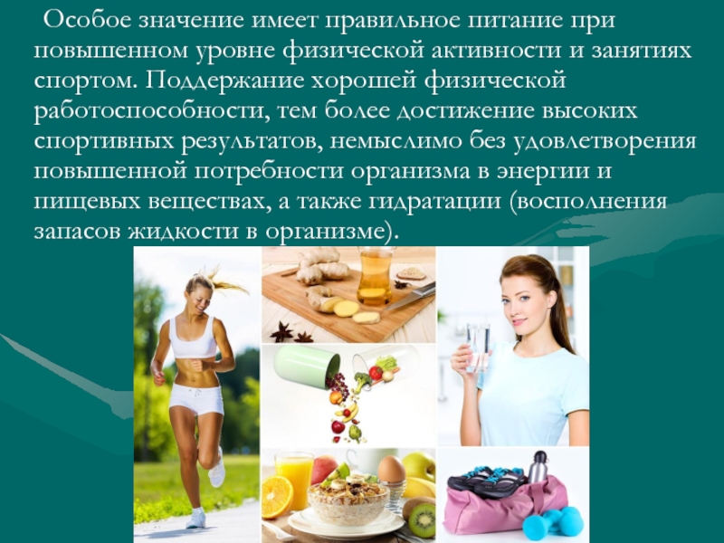Слайд 6 Особое значение имеет правильное питание при повышенном уровне физической активности и
