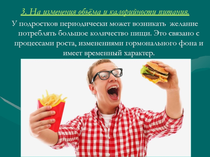 желание потреблять большое количество пищи. Это связано с процессами роста, изменениями гормонального фона и имеет временный характер.