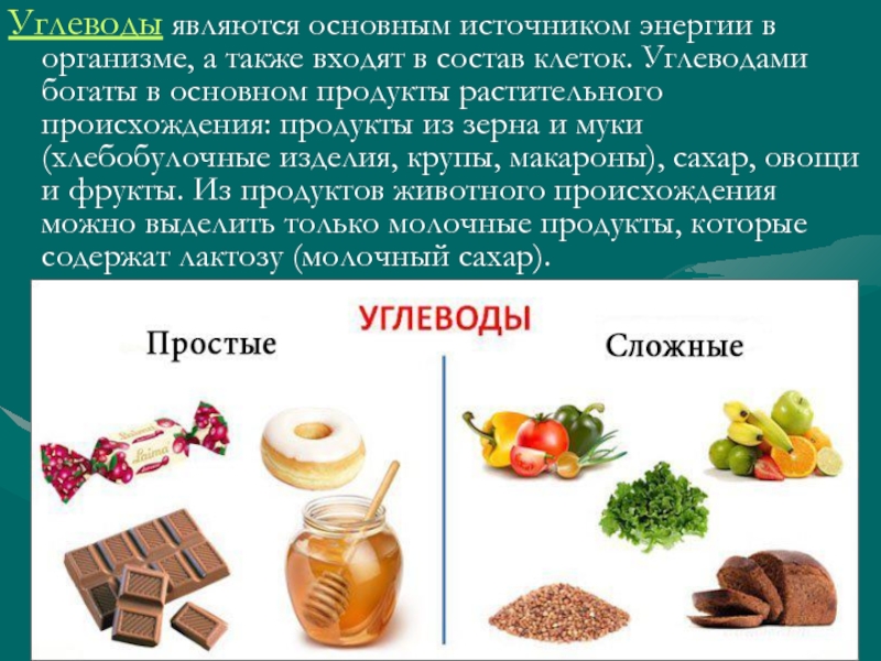 состав клеток. Углеводами богаты в основном продукты растительного происхождения: продукты из зерна и муки (хлебобулочные изделия, крупы, макароны), сахар, овощи и фрукты. Из продуктов животного происхождения можно выделить только молочные продукты, которые содержат лактозу (молочный сахар).