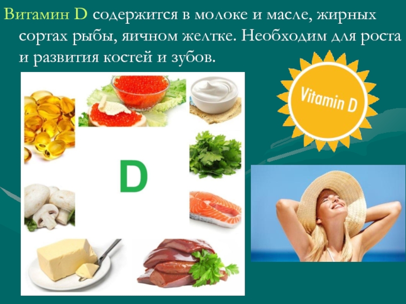 Слайд 36Витамин D содержится в молоке и масле, жирных сортах рыбы, яичном