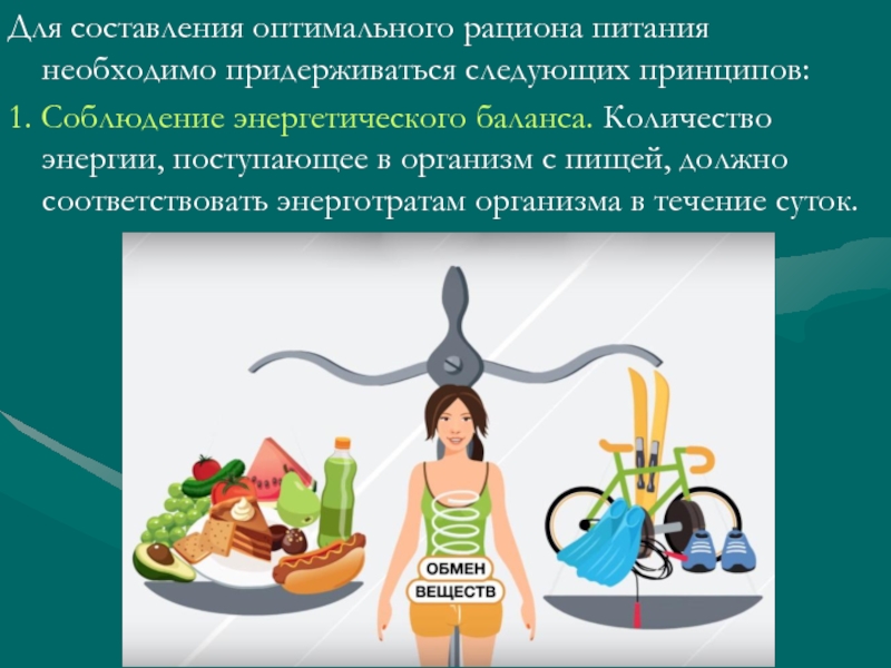 баланса. Количество энергии, поступающее в организм с пищей, должно соответствовать энерготратам организма в течение суток.