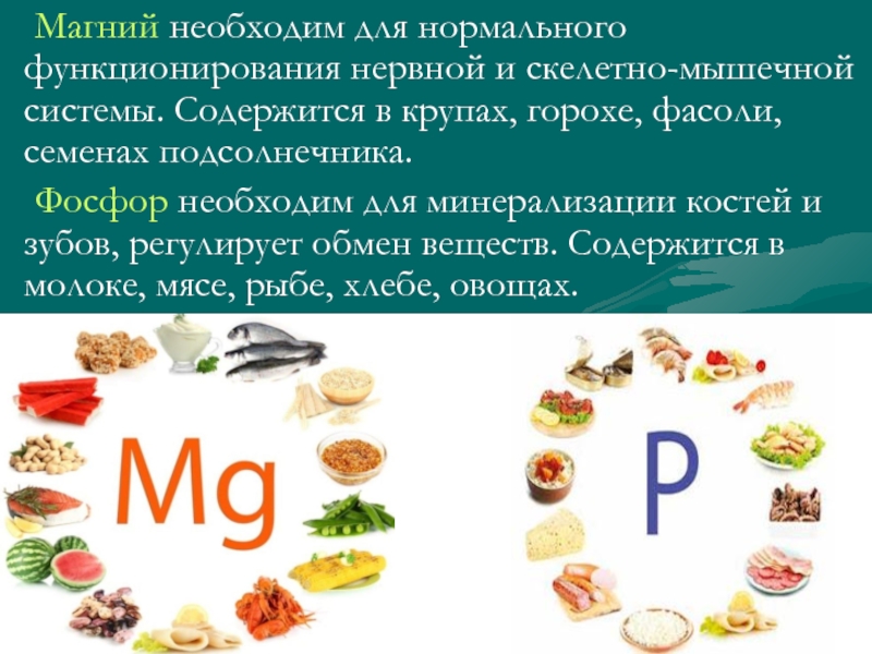 Фосфор необходим для минерализации костей и зубов, регулирует обмен веществ. Содержится в молоке, мясе, рыбе, хлебе, овощах.