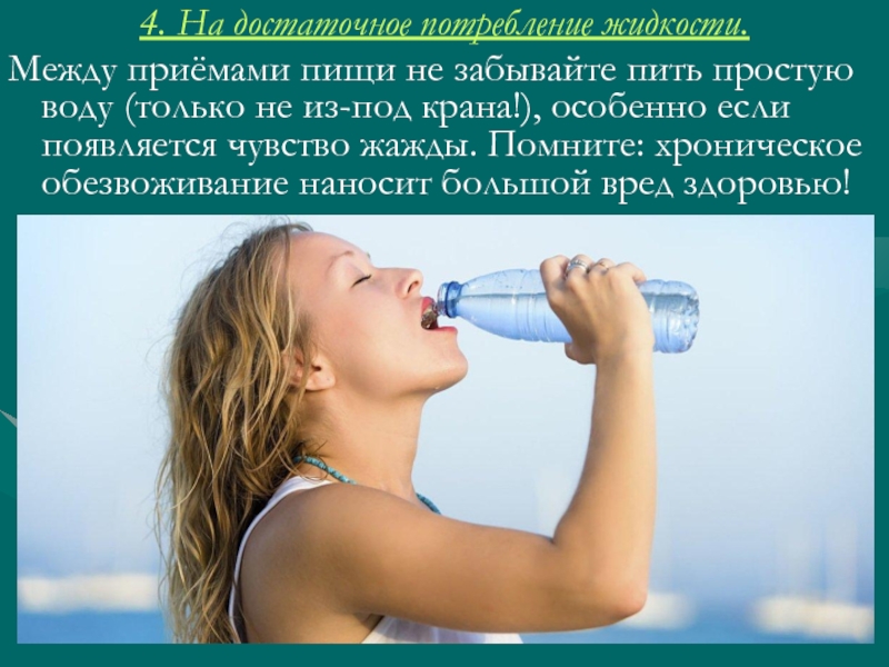 воду (только не из-под крана!), особенно если появляется чувство жажды. Помните: хроническое обезвоживание наносит большой вред здоровью!