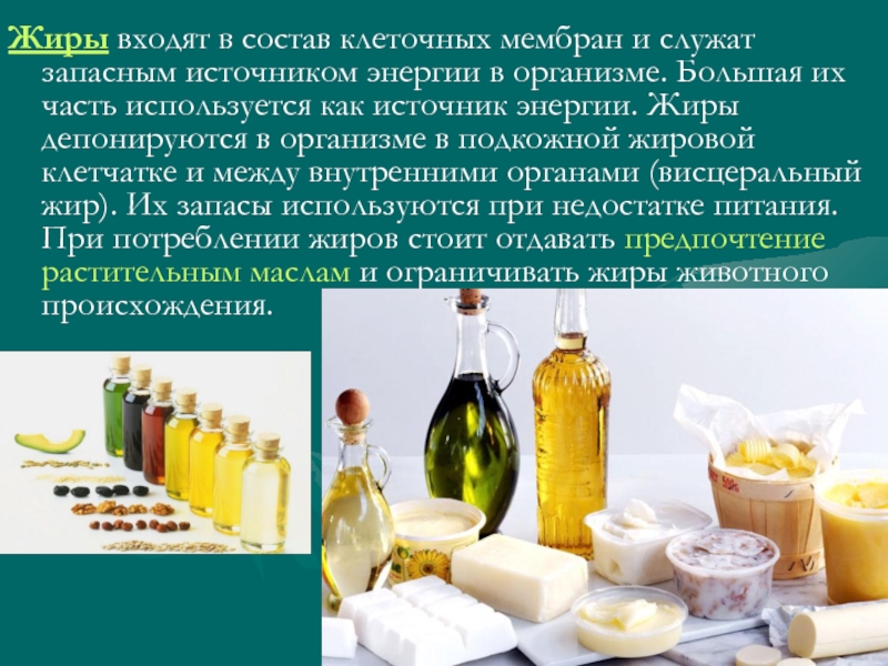 Слайд 26Жиры входят в состав клеточных мембран и служат запасным источником энергии