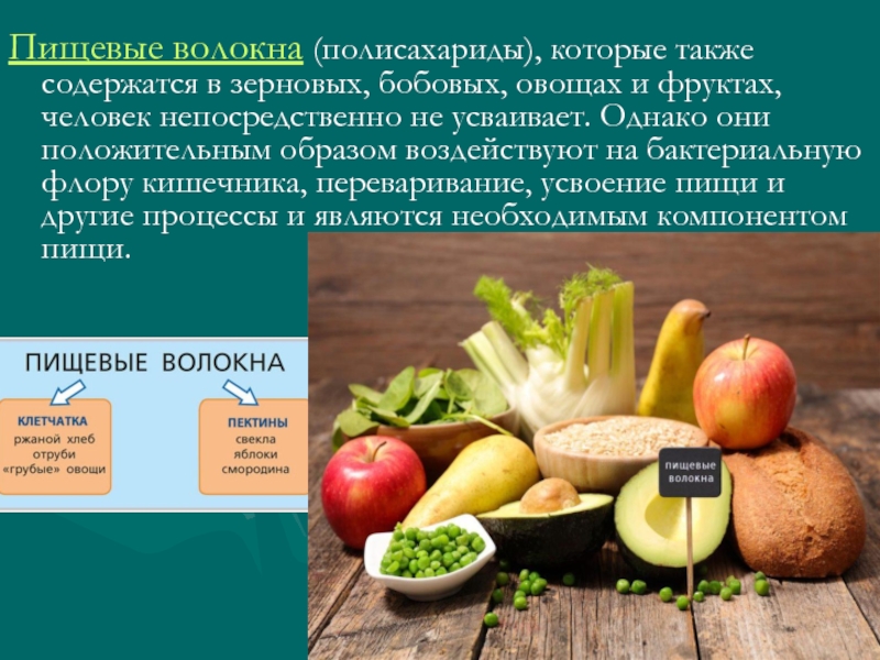 Слайд 30Пищевые волокна (полисахариды), которые также содержатся в зерновых, бобовых, овощах и