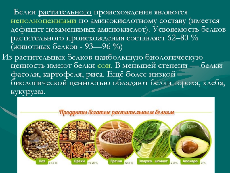 аминокислот). Усвояемость белков растительного происхождения составляет 62–80 % (животных белков - 93—96 %)