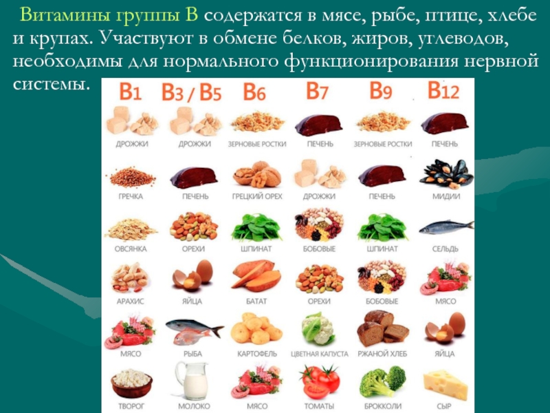 Слайд 34 Витамины группы В содержатся в мясе, рыбе, птице, хлебе и крупах.