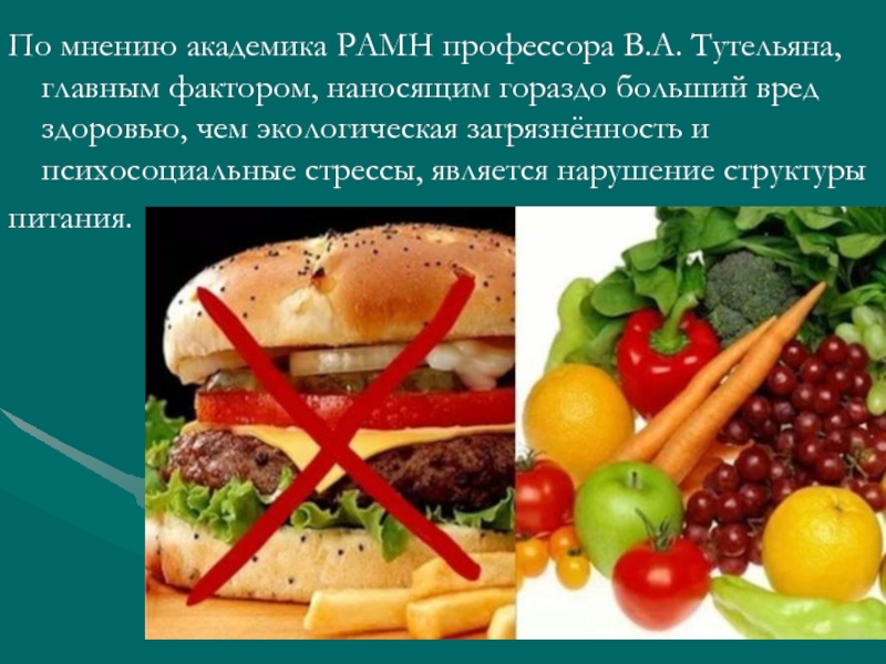 Слайд 4По мнению академика РАМН профессора В.А. Тутельяна, главным фактором, наносящим гораздо