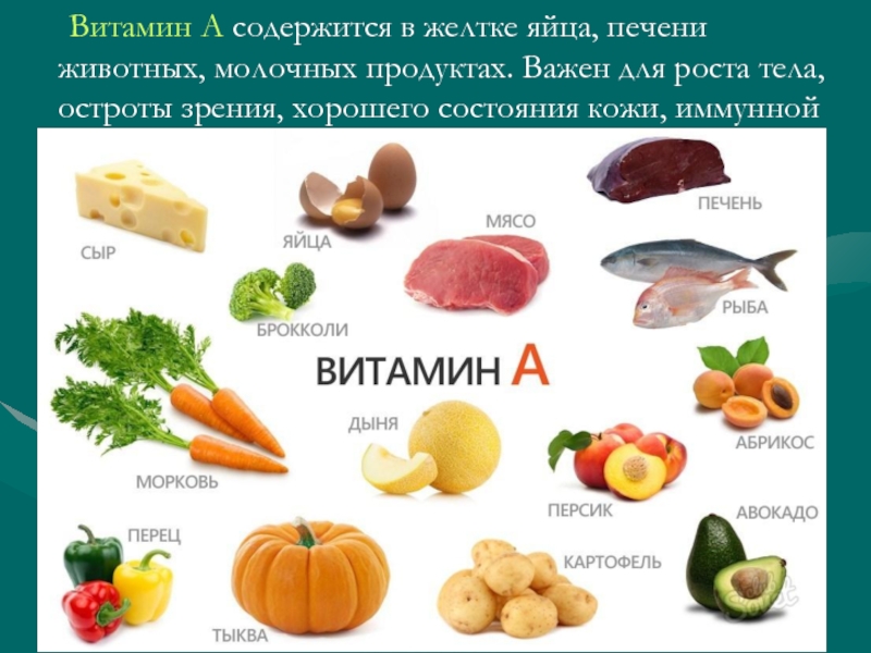 Слайд 33 Витамин А содержится в желтке яйца, печени животных, молочных продуктах. Важен