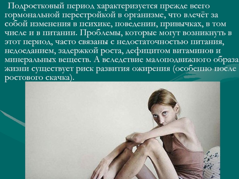 за собой изменения в психике, поведении, привычках, в том числе и в питании. Проблемы, которые могут возникнуть в этот период, часто связаны с недостаточностью питания, недоеданием, задержкой роста, дефицитом витаминов и минеральных веществ. А вследствие малоподвижного образа жизни существует риск развития ожирения (особенно после ростового скачка).