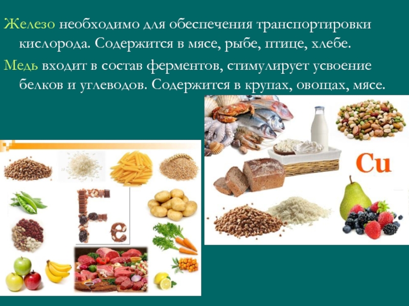 Слайд 43Железо необходимо для обеспечения транспортировки кислорода. Содержится в мясе, рыбе, птице,