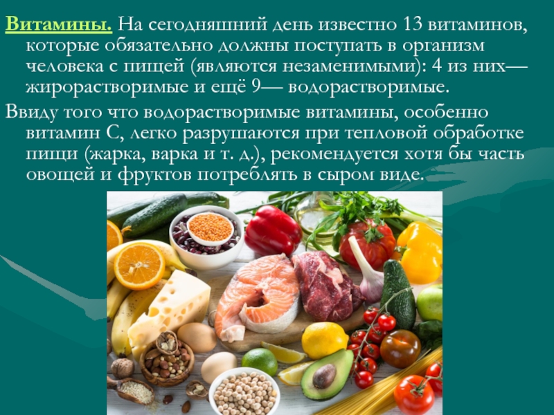 Слайд 31Витамины. На сегодняшний день известно 13 витаминов, которые обязательно должны поступать