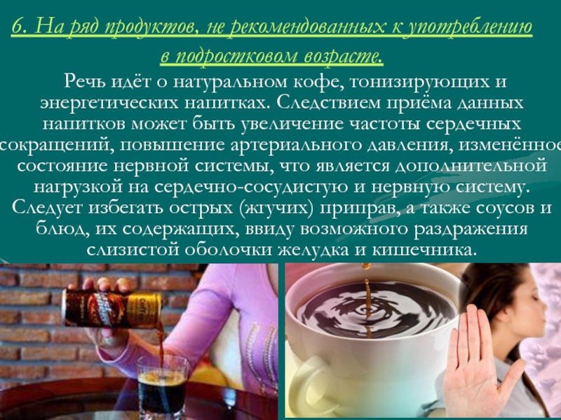 идёт о натуральном кофе, тонизирующих и энергетических напитках. Следствием приёма данных напитков может быть увеличение частоты сердечных сокращений, повышение артериального давления, изменённое состояние нервной системы, что является дополнительной нагрузкой на сердечно-сосудистую и нервную систему. Следует избегать острых (жгучих) приправ, а также соусов и блюд, их содержащих, ввиду возможного раздражения слизистой оболочки желудка и кишечника.