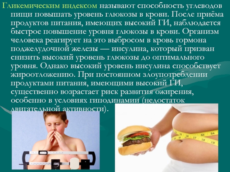 После приёма продуктов питания, имеющих высокий ГИ, наблюдается быстрое повышение уровня глюкозы в крови. Организм человека реагирует на это выбросом в кровь гормона поджелудочной железы — инсулина, который призван снизить высокий уровень глюкозы до оптимального уровня. Однако высокий уровень инсулина способствует жироотложению. При постоянном злоупотреблении продуктами питания, имеющими высокий ГИ, существенно возрастает риск развития ожирения, особенно в условиях гиподинамии (недостаток двигательной активности).