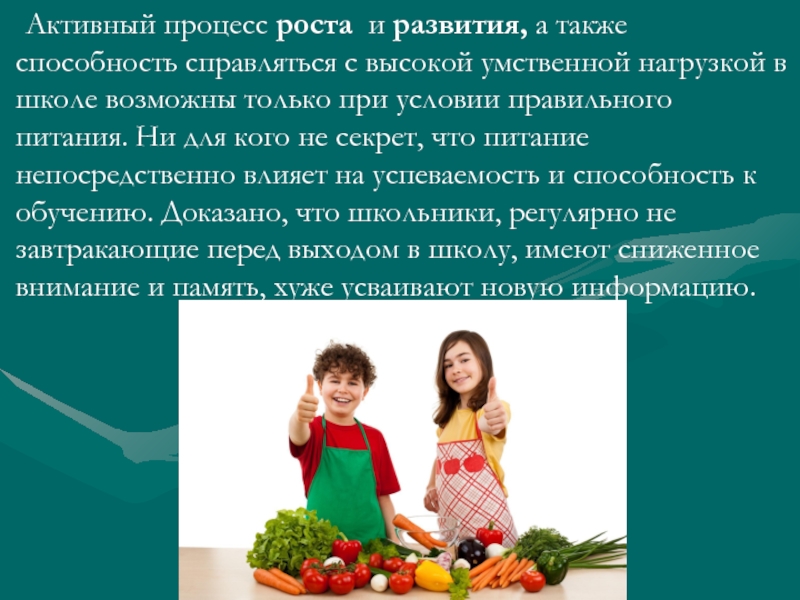 умственной нагрузкой в школе возможны только при условии правильного питания. Ни для кого не секрет, что питание непосредственно влияет на успеваемость и способность к обучению. Доказано, что школьники, регулярно не завтракающие перед выходом в школу, имеют сниженное внимание и память, хуже усваивают новую информацию.