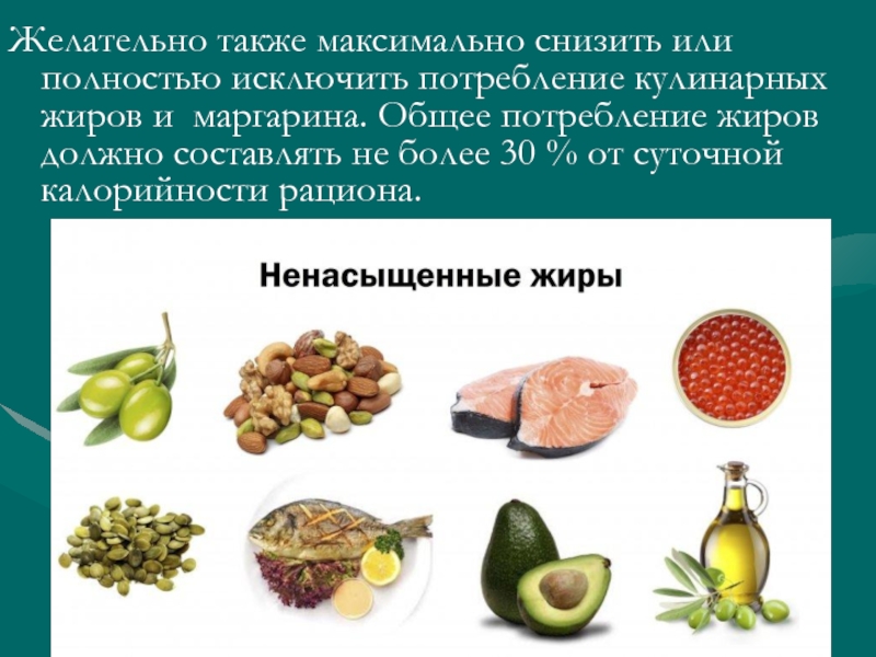 Слайд 27Желательно также максимально снизить или полностью исключить потребление кулинарных жиров и