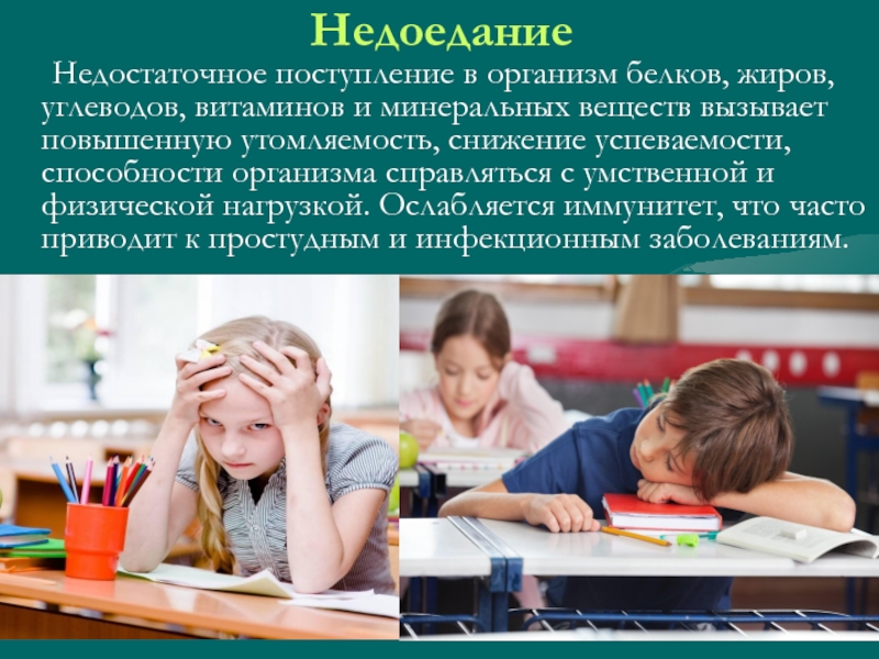 вызывает повышенную утомляемость, снижение успеваемости, способности организма справляться с умственной и физической нагрузкой. Ослабляется иммунитет, что часто приводит к простудным и инфекционным заболеваниям.