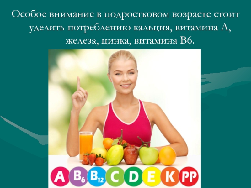 Слайд 8Особое внимание в подростковом возрасте стоит уделить потреблению кальция, витамина А,
