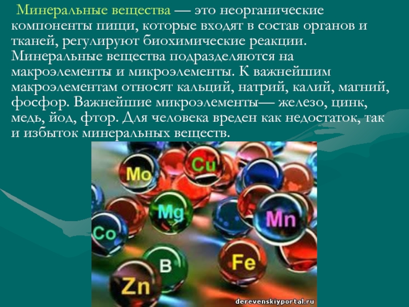 органов и тканей, регулируют биохимические реакции. Минеральные вещества подразделяются на макроэлементы и микроэлементы. К важнейшим макроэлементам относят кальций, натрий, калий, магний, фосфор. Важнейшие микроэлементы— железо, цинк, медь, йод, фтор. Для человека вреден как недостаток, так и избыток минеральных веществ.