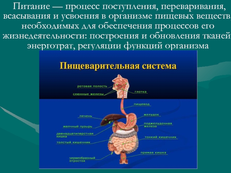 Слайд 3 Питание — процесс поступления, переваривания, всасывания и усвоения в организме пищевых