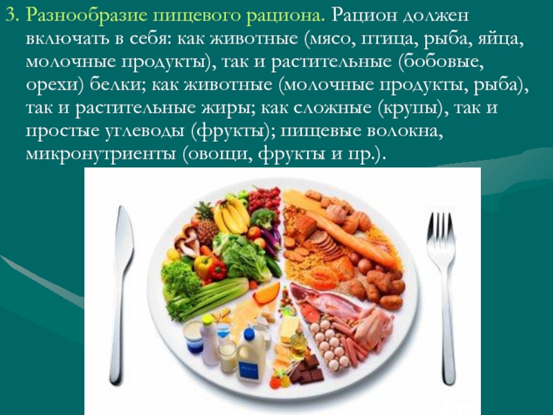 Слайд 473. Разнообразие пищевого рациона. Рацион должен включать в себя: как животные