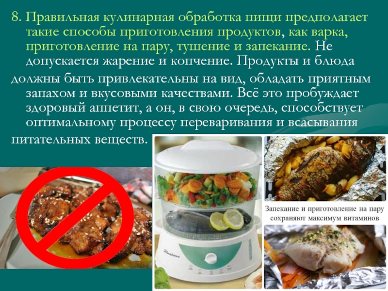 Слайд 538. Правильная кулинарная обработка пищи предполагает такие способы приготовления продуктов, как