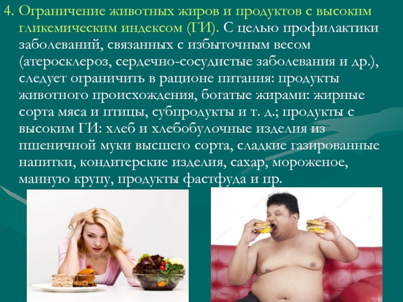 Слайд 484. Ограничение животных жиров и продуктов с высоким гликемическим индексом (ГИ).