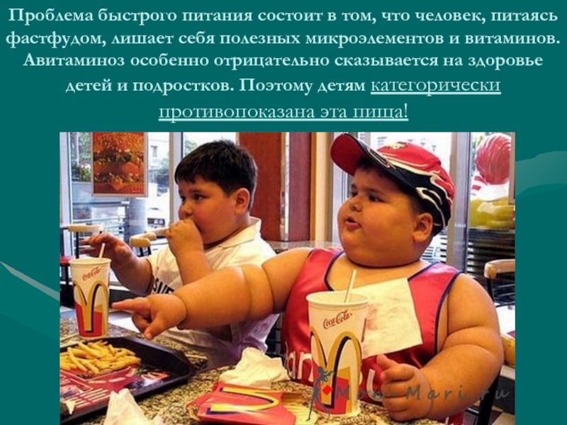 Слайд 14Проблема быстрого питания состоит в том, что человек, питаясь фастфудом, лишает
