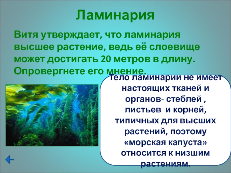 Тело ламинарии не имеет настоящих тканей и органов- стеблей , листьев и корней, типичных для высших растений, поэтому «морская капуста» относится к низшим растениям.
