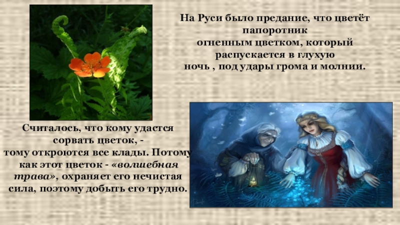 тому откроются все клады. Потому как этот цветок - «волшебная трава», охраняет его нечистая сила, поэтому добыть его трудно.